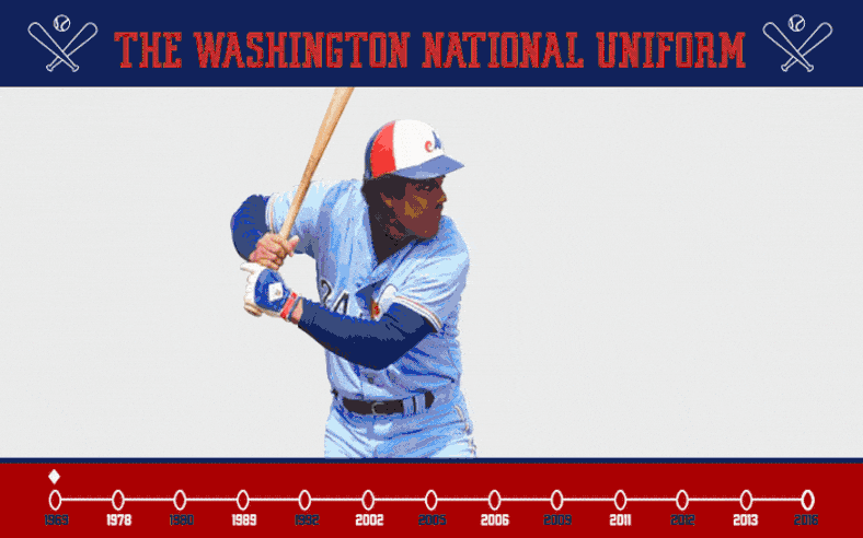 We decided to depict the details of the Nationals’ ever-changing uniform throughout their years in the league. Read on to see how these red, white, and navy blue–wearing patriots have modified and honored their various uniforms over time.
